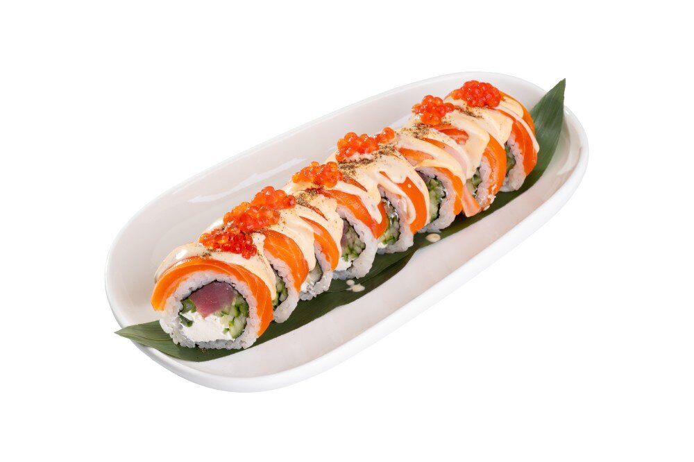 Тунец, лук зеленый, огурец , лосось, сыр творожный, рис, нори, перец черный, соус спайси, белый соус