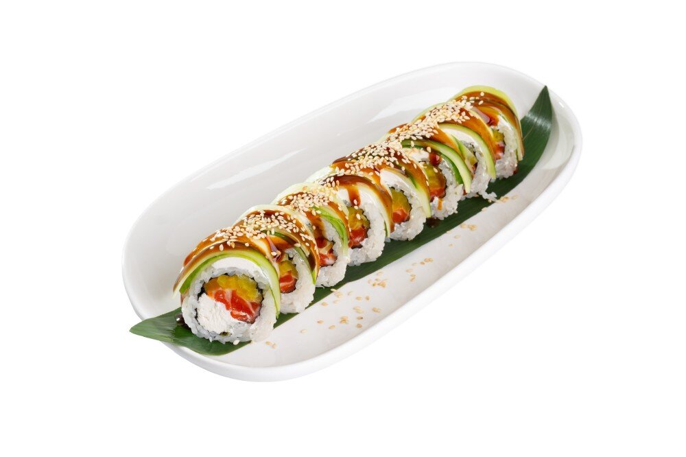 Лосось, редис такуан, огурец, сыр творожный, рис, нори, терияки, кунжут