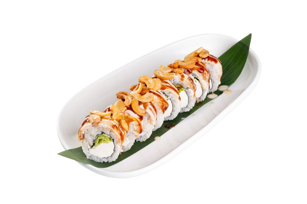 Угорь, сыр творожный, салат айсберг, сурими, терияки, рис, нори, кешью жаренный, белый соус