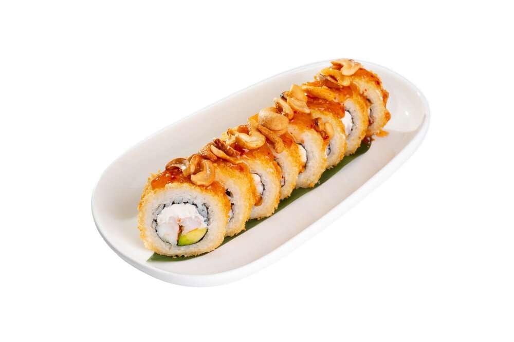 Креветка, авокадо, сладкий чили, сыр творожный, орех кешью соленый, рис, нори