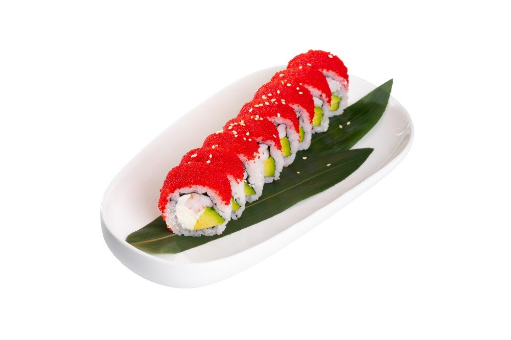 Креветка , огурец , авокадо, сыр творожный, рис, нори, икра тобико