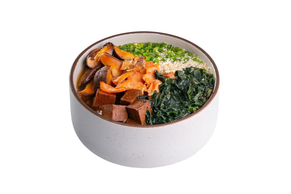Жареный лосось, грибы шиитаке, маринованный тофу, водоросли вакаме, мисо бульон, зеленый лук, кунжут, рис