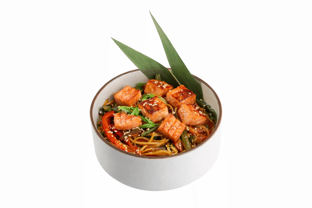 Лосось, перец болгарский, морковь , лук репчатый , цукини, фасоль спаржевая, соус вок, бульон даси, кунжут, лук зеленый